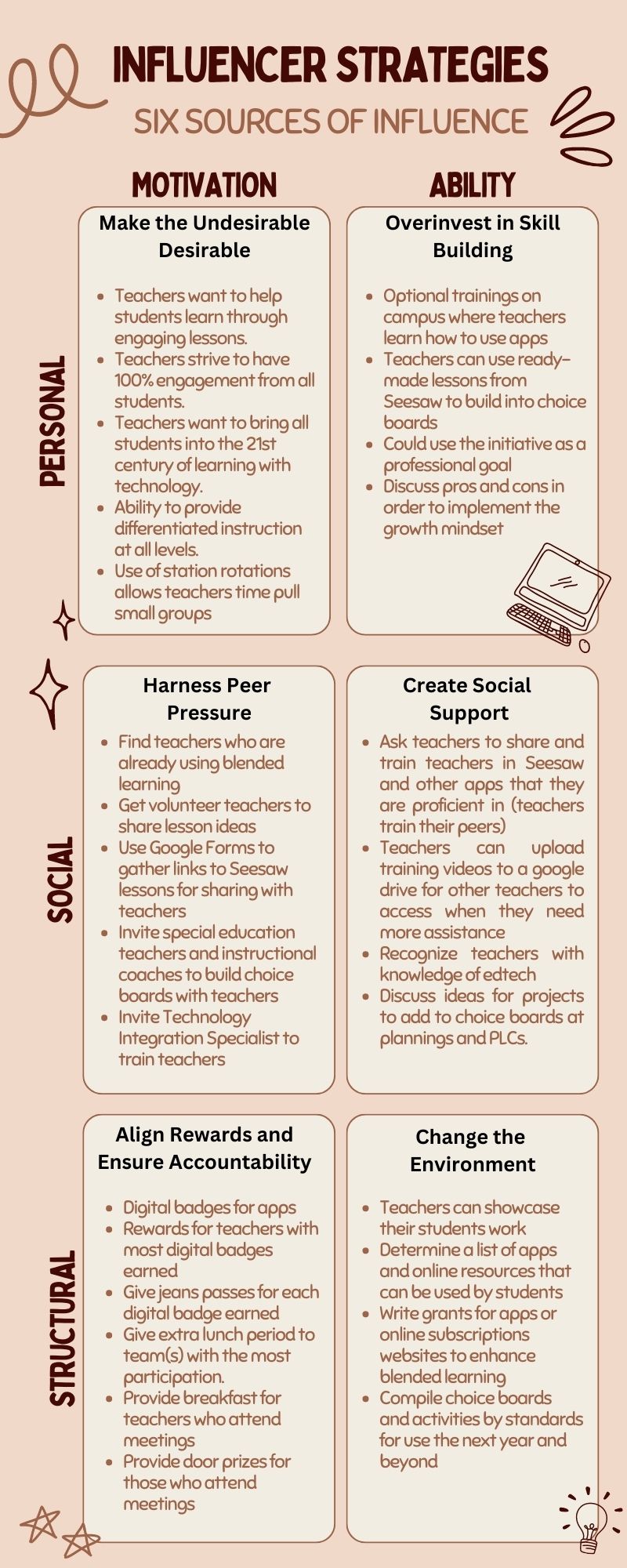 According to the authors of the book, Influencer, once the results are identified and vital behaviors are found, the only thing left is to help people adopt the behaviors through mastering the six sources of influence (Greeny, J., et. al., 2013). My goal is to motivate and influence teachers to implement blended learning in their classrooms while providing support and encouragement without teachers feeling as if more has been added to their plate.